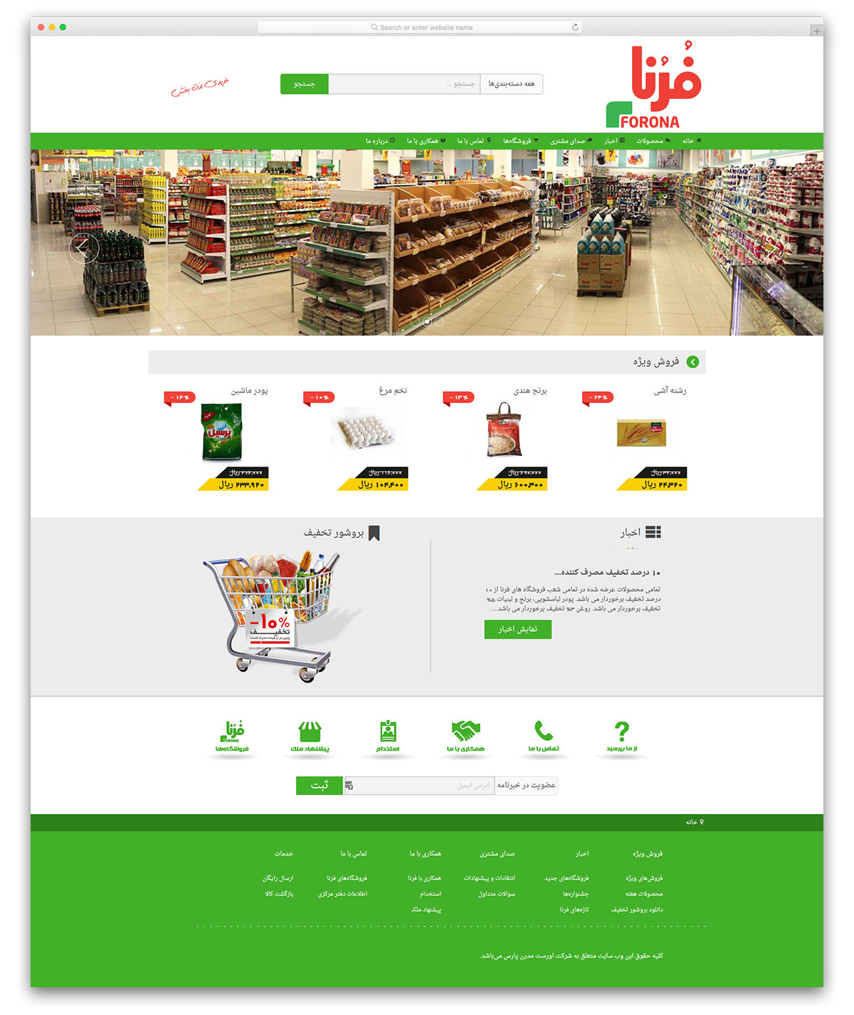 امکانات:واکنش گرا ( Responsive )، دو زبانه، بخش فروشگاه، جستجو براساس نام و دسته بندی کالا، فیلتر پیشرفته محصولات، جدیدترین و پرفروشترین محصولات، اعمال تخفیف برحسب درصد، پرسش و پاسخ، فرم استخدام و همکاری، لیست فروشگاهها براساس منطقه و نقشه، بروشور آنلاین، خبرنامه، گالری تصاویر